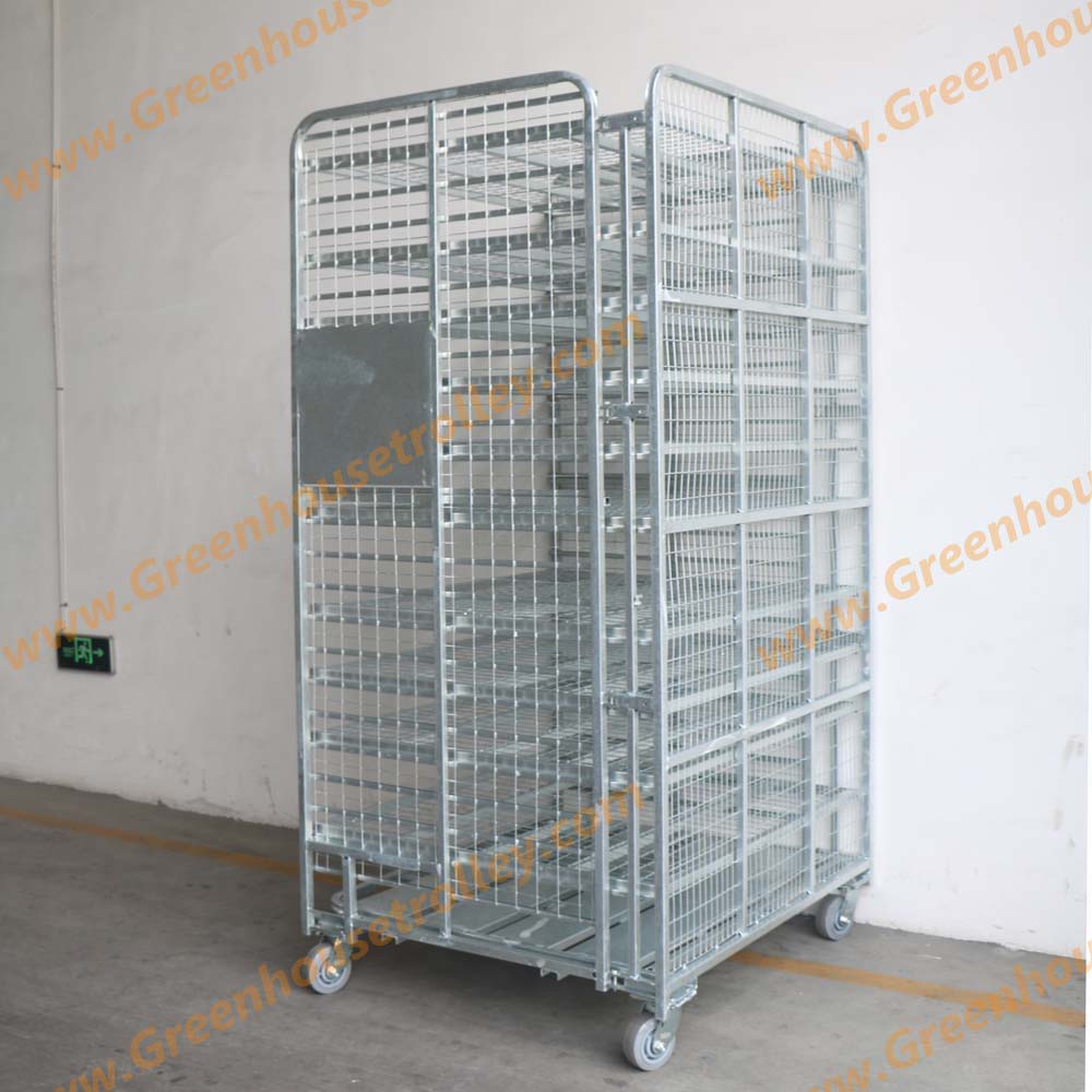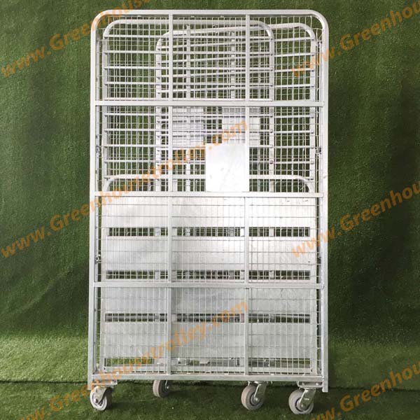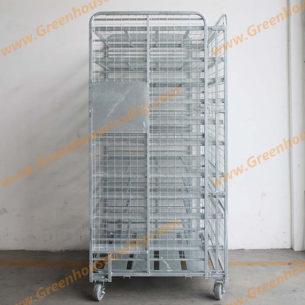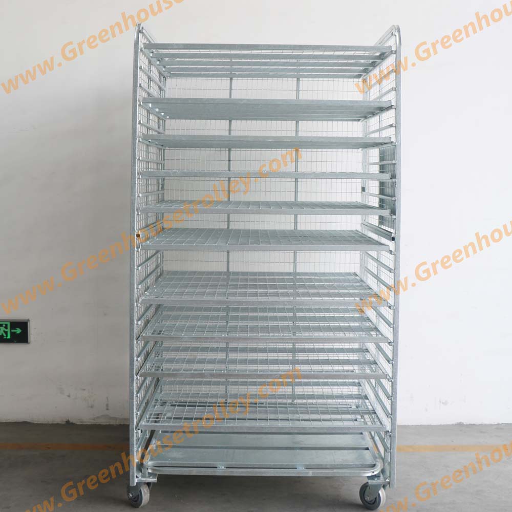 1个金属板底盘 3张钢筋网隔板 3个边挡 尺寸:1092x1219x2083mm 整车载重:750kg 每层载重:150kg 5寸橡胶脚轮:2个固定+2个转向 层板数量可根据客户要求增减 层间距可根据植物高度灵活调节 表面处理:热镀锌