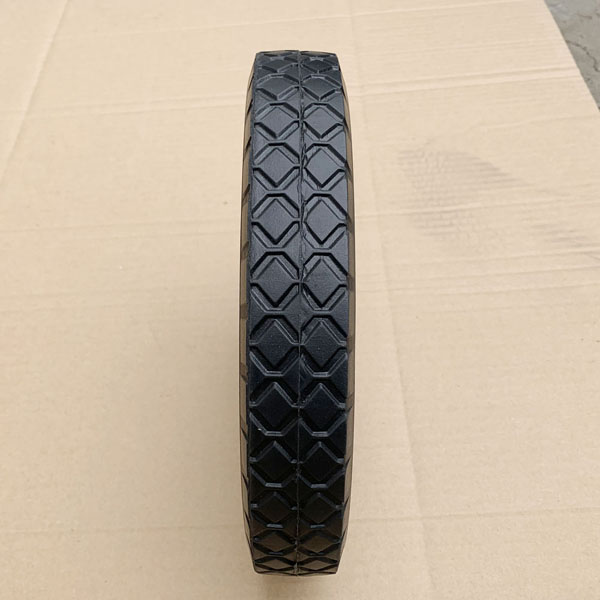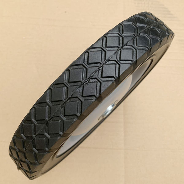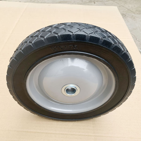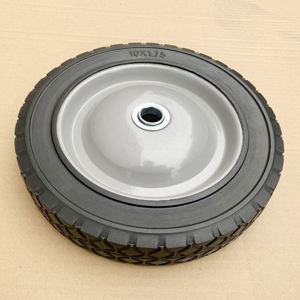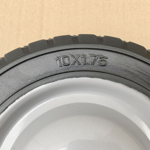 * 1-1/2-inch offset hub and 1/2-inch bore;1-3/4-inch wide X 10-inch diameter semi-pneumatic rubber tire with diamond tread.